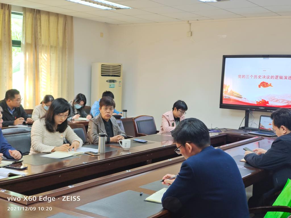 会议邀请了马克思主义学院陈爱华博士深入解读十九届六中全会精神。陈爱华博士讲述了党的三个历史决议。陈博士从党的三个历史决议的逻辑演进、党的三个历史决议的共同特点、党的三个历史决议的历史启示、建党百年的历史经验总结四个方面详述了历史决议。
