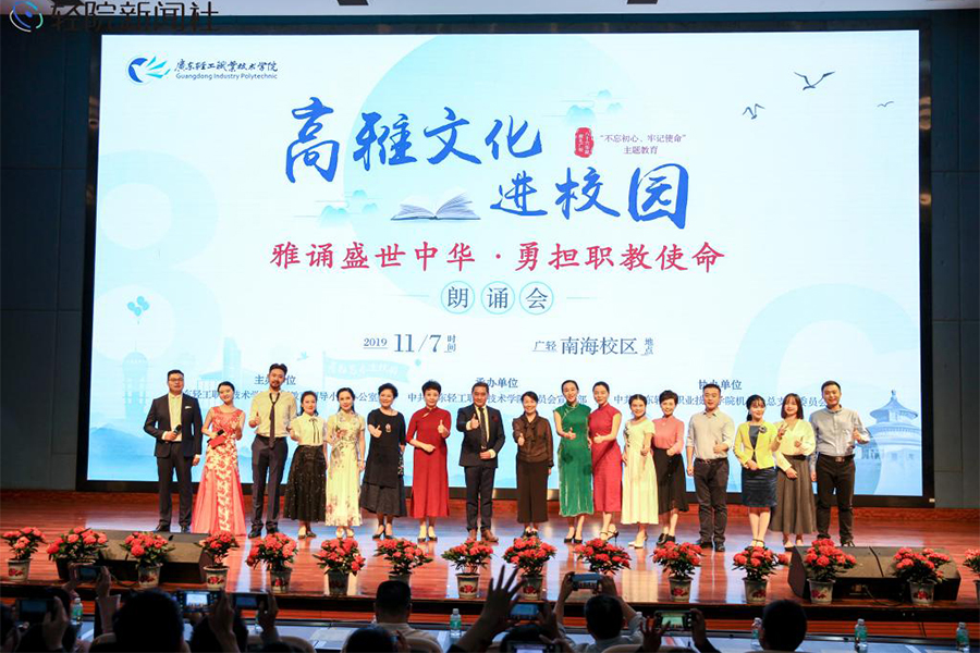 11月7日,我校“雅诵盛世中华·勇担职教使命”主题教育朗诵会在南海校区图书馆报告厅举行。《大写的中国》《黄河入海流》《党费》等12个作品精彩纷呈,讴歌革命历史,颂扬奋斗精神。祖晴、卢吉雄、魏冬青、田奉丽等13位朗诵名家应邀来校倾情朗诵。副校长王玫瑰等出席活动。活动通过网络直播平台开放直播,吸引了近50万人参与观看。